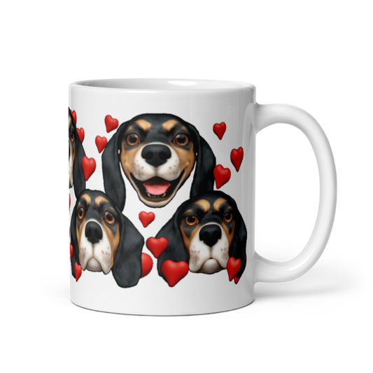Glossy Beagle Mug, Black Tan and White with Black mask, Hearts