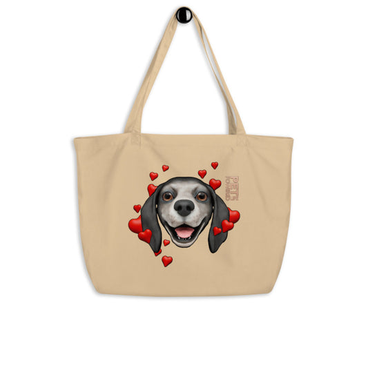 Happy Beagle Large Organic Tote, Black with White mask, Hearts