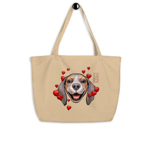 Happy Beagle Large Organic Tote, Blue, White and Tan with White stripe, Hearts