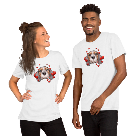 Happy Beagle Unisex t-shirt, Blue, White and Tan with White stripe, Hearts