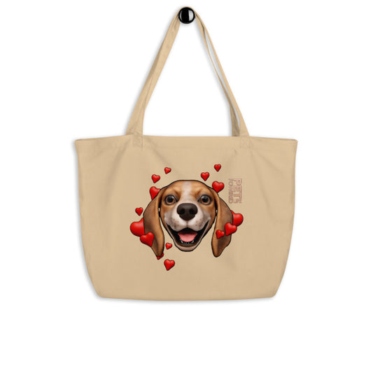 Happy Beagle Large Organic Tote, Dark Tan with White stripe, Hearts