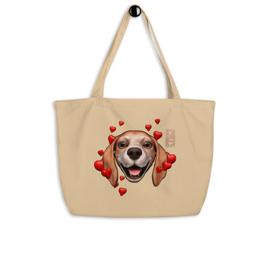 Happy Beagle Large Organic Tote, Red with White mask, Hearts